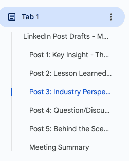 Now I can pull from my post document that was sent to my email and she even gives me a nice little summary before she dives into the hook bank, post copy, and the spreadsheet where everything is auto populated.