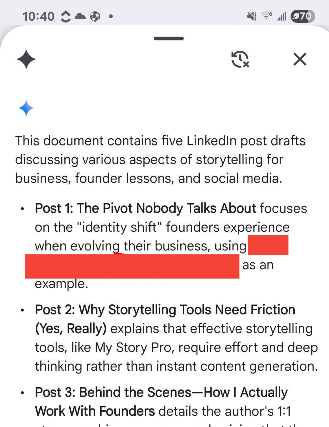 Please find the lie but I no joke wake up to emails from my AI Storytelling LinkedIn agent with story ideas from moments and topics I completely forgot I even talked about in my coaching calls, team meetings and 1:1 client work.