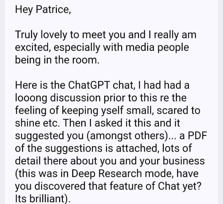 She explained that she asked ChatGPT to help her find people or programs that could help her show up more clearly in her business. It gave her a list of maybe seven or eight recommendations.