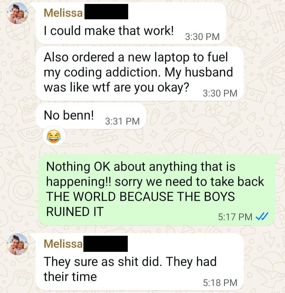 Melissa and Joana are the two women on my right (KILLING it with their hand hearts I might add) and Melissa just updated our Whatsapp group chat today appropriately titled “Supernerd Mom Coalition”: